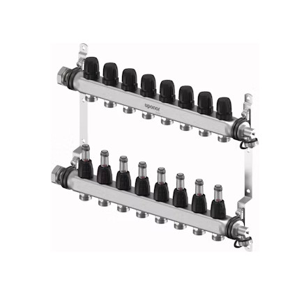 Ruostumattomasta teräksestä valmistettu esikasattu jakotukki, joka sisältää virtausmittarit. Jakotukkia on saatavana 2-12 lähtöisenä ja se voidaan halutessa asentaa Uponor Vario -jakotukkikaappiin.