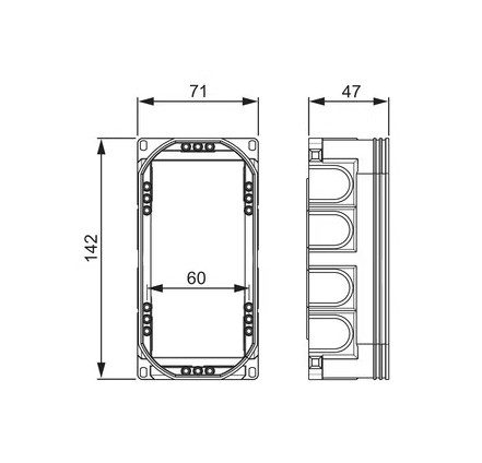 Rasiassa on 11 kpl aihioita sivuilla ja pohjassa kuusi aihiota pohjanysille. Kojerasiaan voidaan asentaa myös kolmoiskoje. Tarvittaessa kojerasia jaetaan kahteen osaan välilevyllä PMR345. Valmistettu halogeenittomasta materiaalista (IEC/61249-2-21).