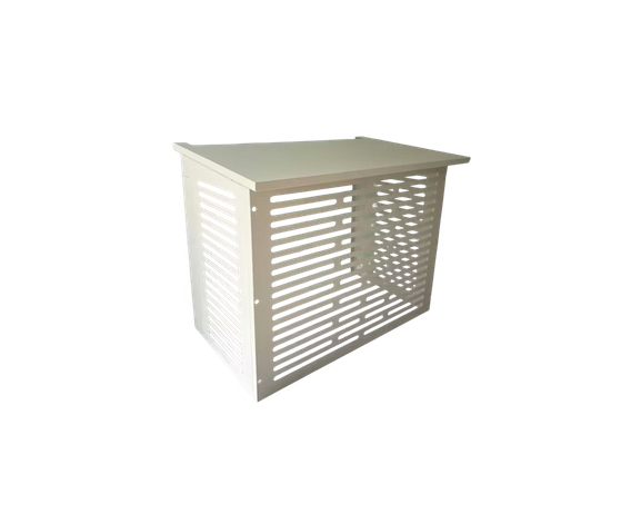 Valkoinen ilmalämpöpumpun suojakotelo. Voidaan kiinnittää myös maatelineeseen. Kiinnitystarvikkeet maatelineasennukseen myydään erikseen