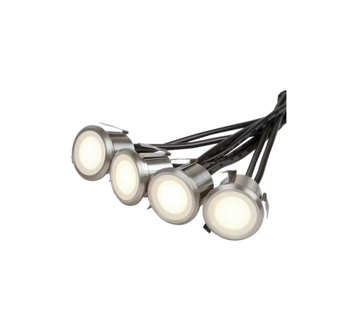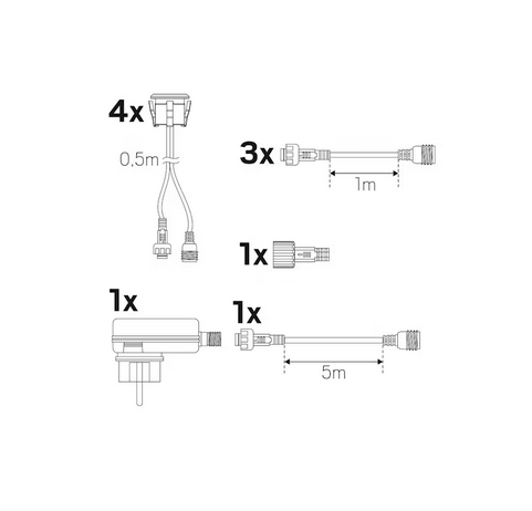Mukana on 2 kpl 0,5 m kumikaapelia ruuviliittimillä. Sarjaan sisältyy 4 kpl valaisimia, 3 kpl 1 m jatkokaapeleita pikaliittimellä sekä 1 kpl IP44 plug-in-muuntaja 5 m johdolla.