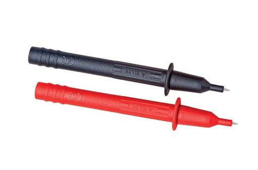 The Extech TL743 Slim Reach Test Probe Set has a sharp point for piercing insulation. This test probe set has a 0.7 inch long tip with 0.08 inch diameter. The overall length of the test probes is 4.5 inches. This set includes a protective cap and is rated at CAT IV-600V/10A max and CAT III-1000V.