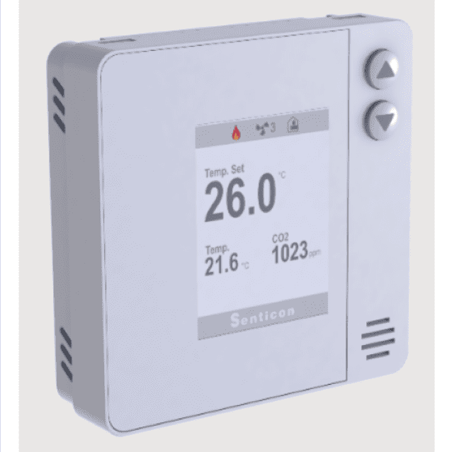 Huonesäätimessä on sisäänrakennettuna lämpötila- ja hiilidioksidi (CO2) mittaus. Lämpötilan asetusarvoa on helppo muuttaa laitteessa olevien painonappien avulla.