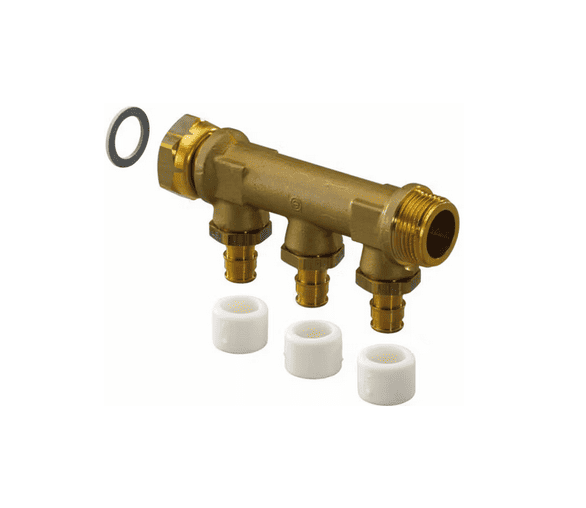 Jakotukki käyttövedelle. Rungossa 3/4″ kierre (uk, sk pyörivä mutteri). 15 mm putket liitetään jakotukkiin Q&E-liitoksilla. c/c 35 mm. Jakotukit eivät sovellu jakotukkikaappiin. Materiaali DR-messinki.