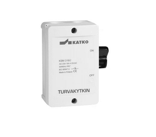 Katkon 3-napainen turvakytkin, jolla on hyvä suoja useita kemikaaleja vastaan ja jonka materiaali on itsesammuva. Kytkimessä on muovikotelo, sekä lukittava väännin. Vakiona kalvotiiviseet 2 x 20 mm (ylös ja alas) ja 2 x 15 mm (pohjassa) sekä vedonpoistajat (2 kpl). Kytkimen kansi on sinetöitävissä ja väännin on sinetöitävissä ON-asentoon.