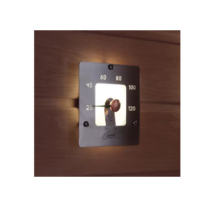 Neliön muotoinen saunan lämpömittari on valmistettu satiinimassalasista sekä hiotusta rst-asteikosta. Mittari valaistuu yhdellä 2-4 mm kuidulla. Asennetaan paneloinnin yhteydessä. Mittarin koko on 120 x 120 mm ja upotussyvyys 40 mm. Ulkonema seinäpinnasta 20 mm. Kiinnittyy seinäpaneliin kolmella mukana tulevalla rst-ruuvilla.